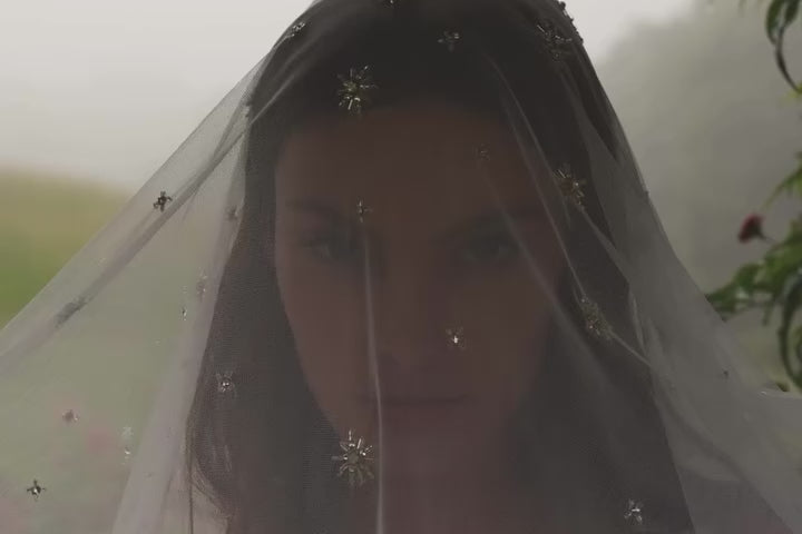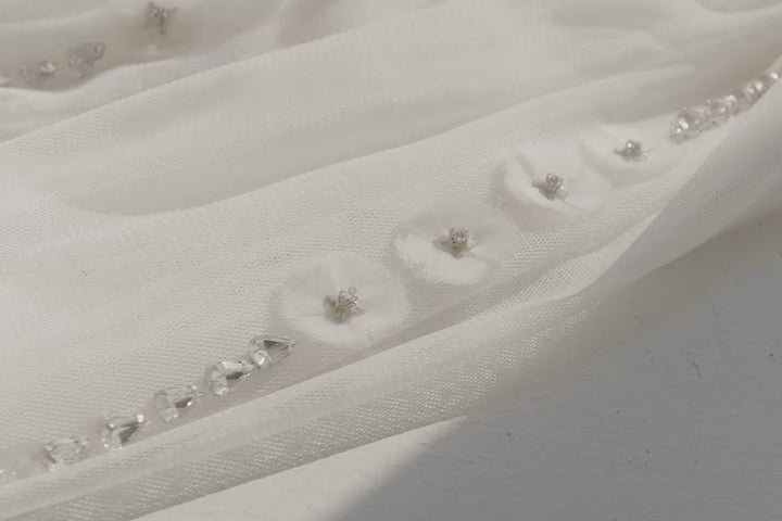 The Aubrey Cape embodies ethereal romance. This gorgeous couture piece is exquisitely tailored for an effortless, elegant drape. The delicate chiffon is hand-embroidered with trailing hand-cut flowers, accented with faceted crystals and bugle beads. Subtle shades of ivory and pale silver add dimension to this timeless stunner.