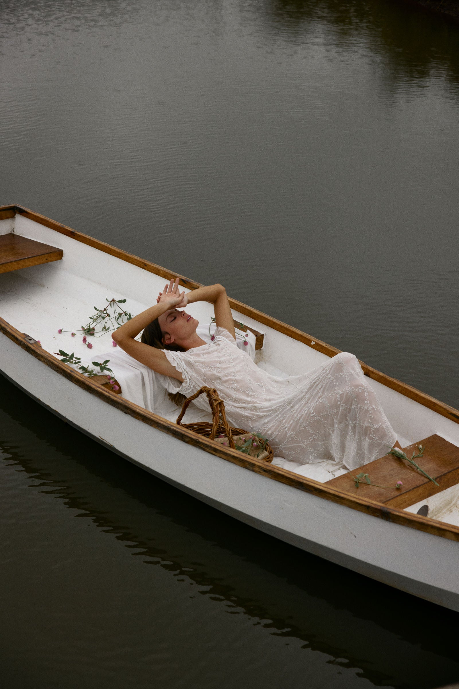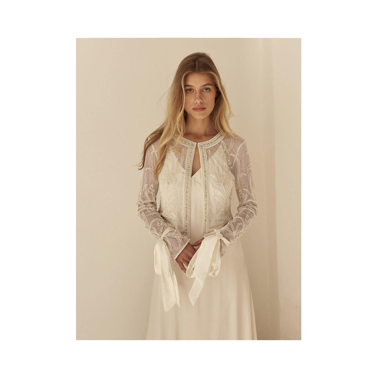 The Remi Jacket is a Bo & Luca bride favourite - endlessly versatile, timeless and elegant. This unforgettable couture piece is hand-embroidered with an intricate motif of climbing marigolds, suspended on fine Italian tulle. A border of faceted crystals, glass beads and sequins edges the neckline and hem. Soft silk wrist ties add a playful touch.