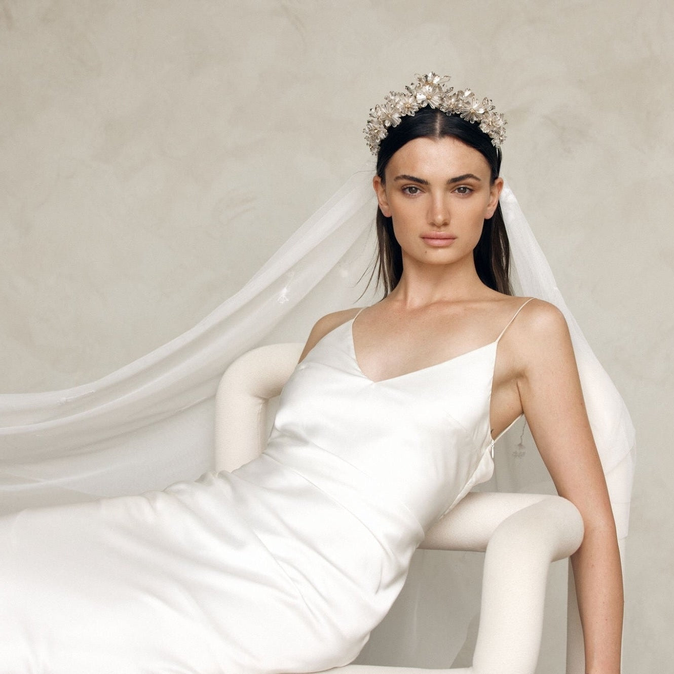The Aubrey Cape embodies ethereal romance. This gorgeous couture piece is exquisitely tailored for an effortless, elegant drape. The delicate chiffon is hand-embroidered with trailing hand-cut flowers, accented with faceted crystals and bugle beads. Subtle shades of ivory and pale silver add dimension to this timeless stunner.