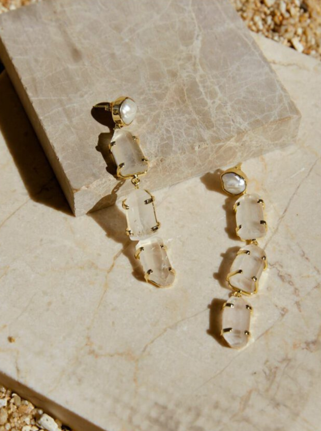 The Adita Earrings are full of bohemian charm. A trio of softly polished quartz crystals are suspended from a single freshwater pearl. Handset in 18k rolled gold, the post is secured with a butterfly fastening.