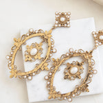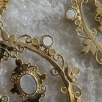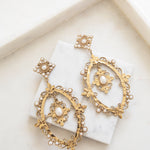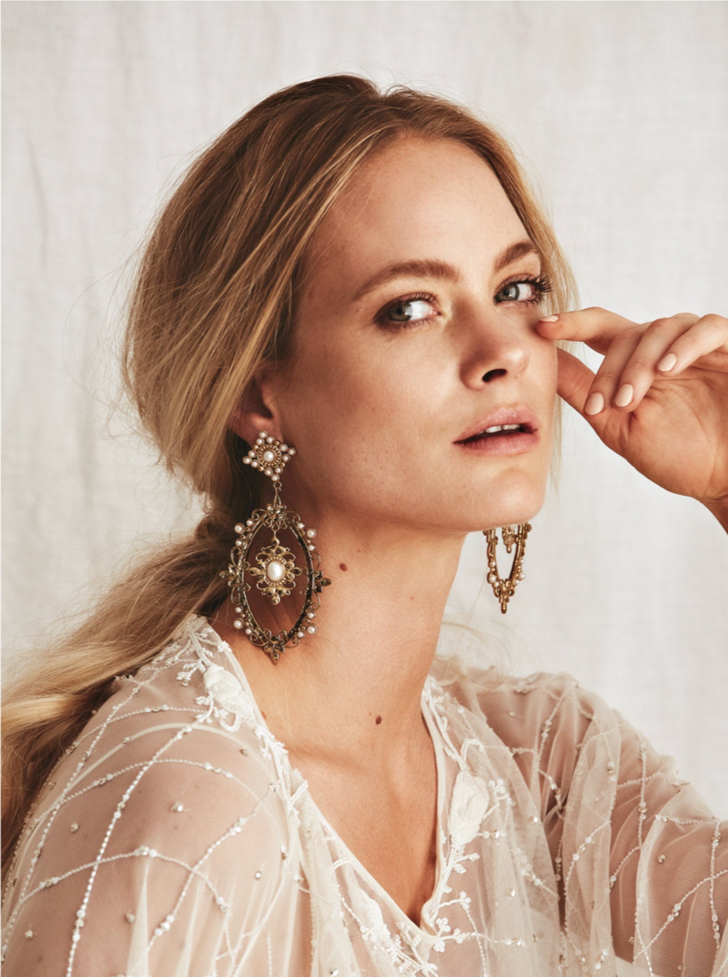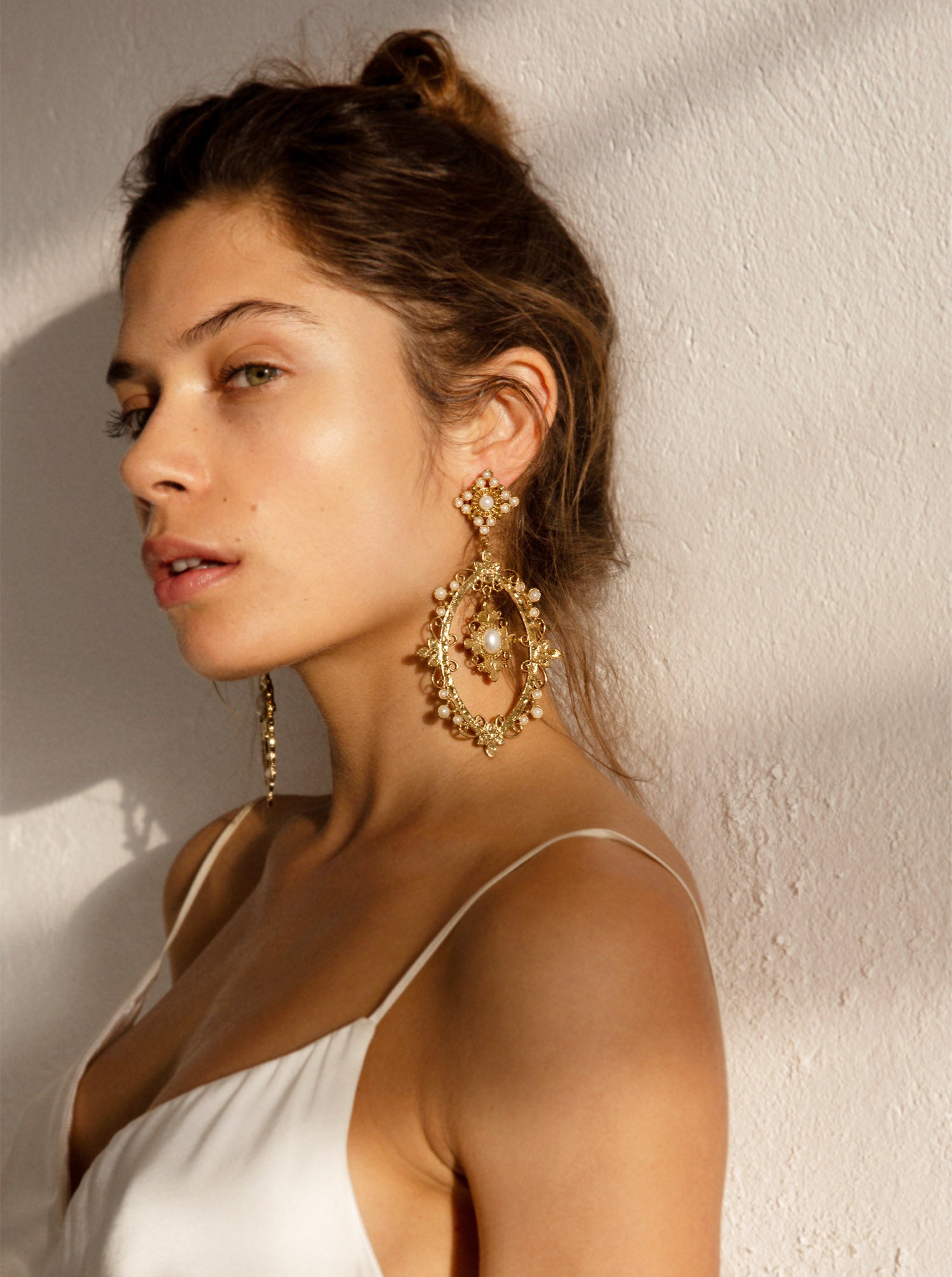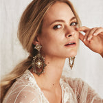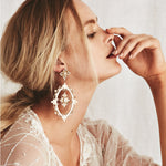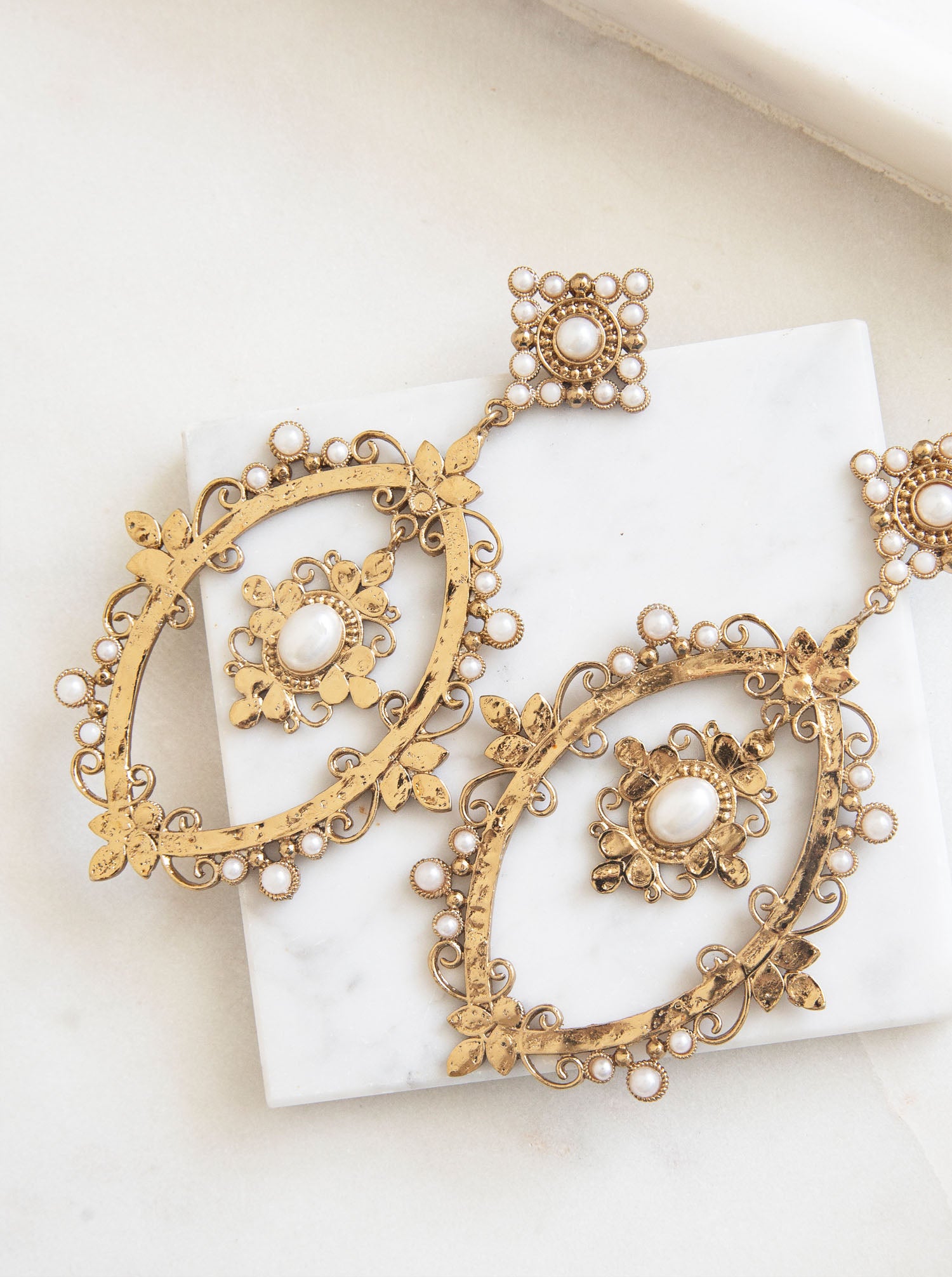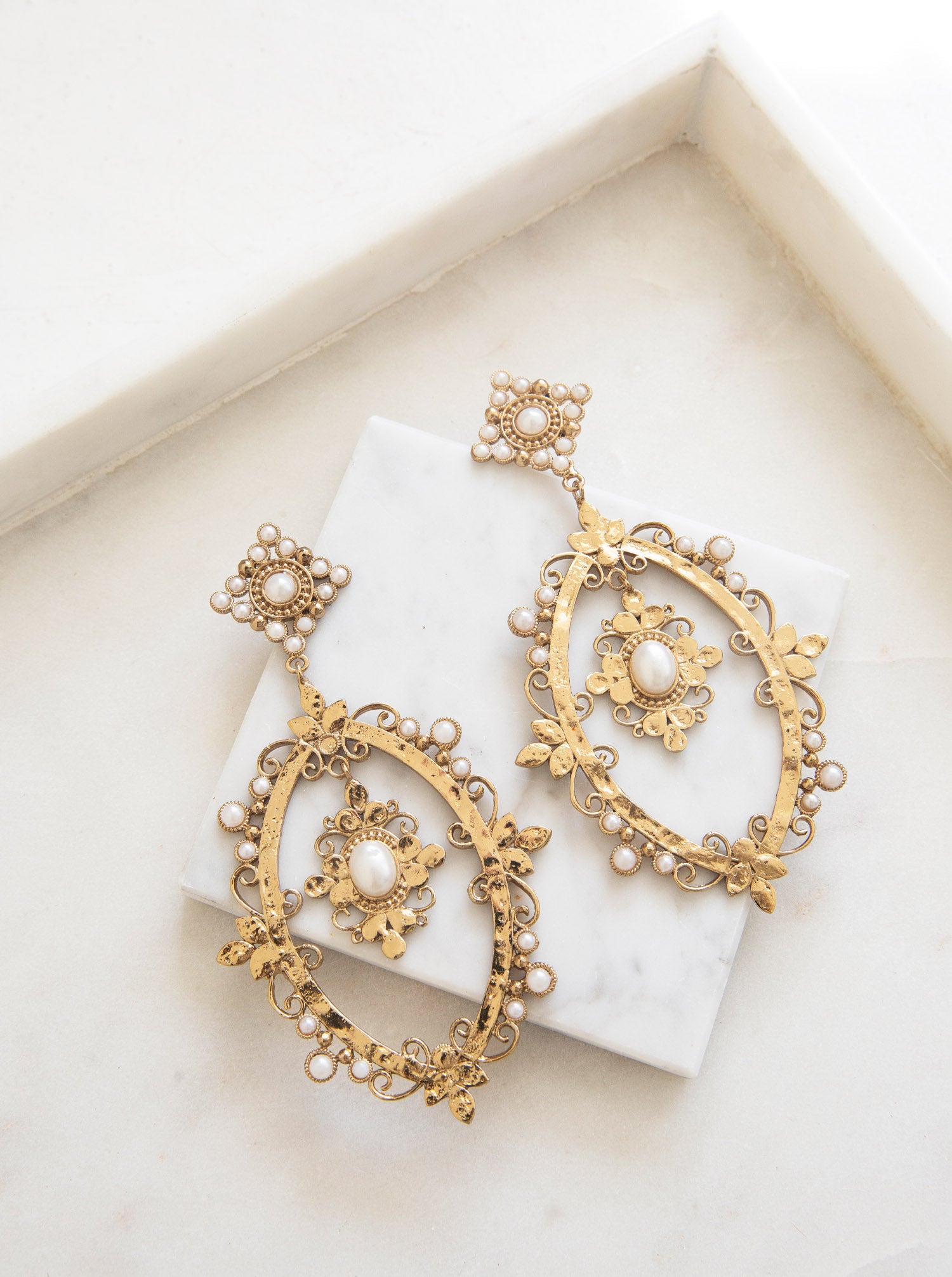 Our bestselling Aurelia Earrings are back in stock! Full of Bohemian charm, these striking chandelier drops are handcrafted from 18k rolled gold, inset with hand-cut Mother-of-Pearl. Stand out on your wedding day with these unforgettable statement earrings