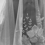 The Ella Veil is an ethereal Juliet-style veil, adorned with hand-beaded flowers and delicate leaves. Rendered in glass beads, sequins and faux pearls in shades of ivory and pale gold. Softly gathered at either side of the face, small thread loops concealed beneath the flowers allow the veil to be pinned in place. The dramatic train drapes to the floor, floating gently behind you as you walk.