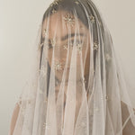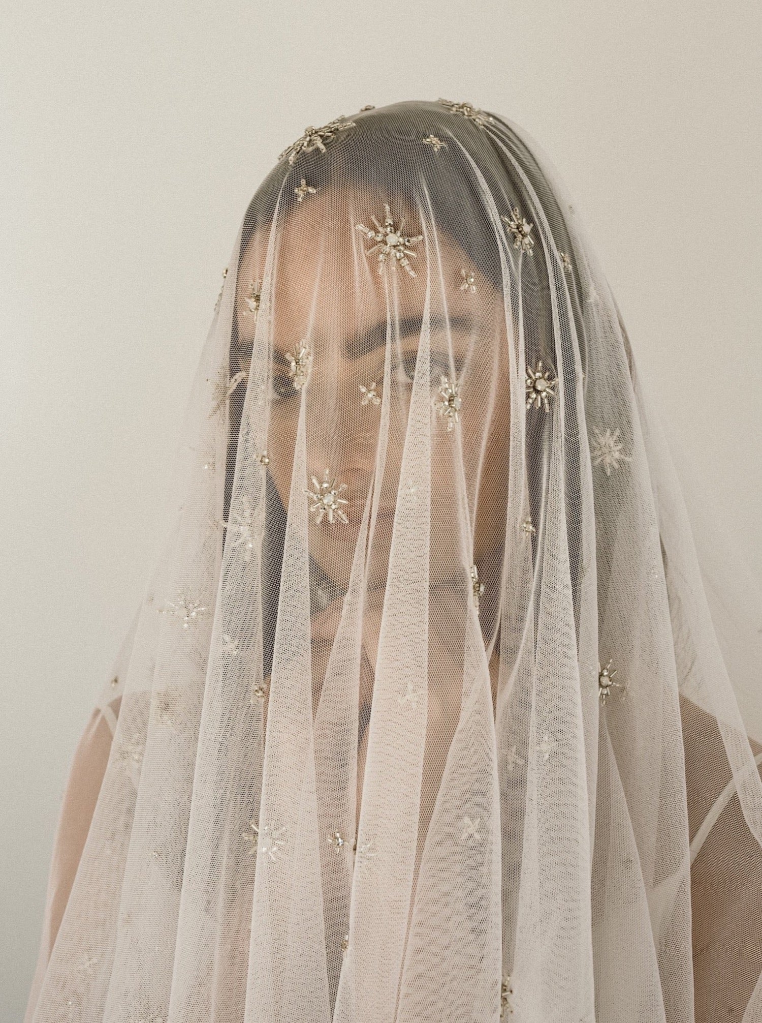 The Sitaara Veil is divinely beautiful. A celestial motif is suspended on tulle. Hand-embroidered faceted crystals and bugle beads are accented with moonstones. The embroidery is densest at the crown, with a degradé effect of falling stars. This sweeping cathedral-length veil has a regal train and blusher and is secured with a silver comb.