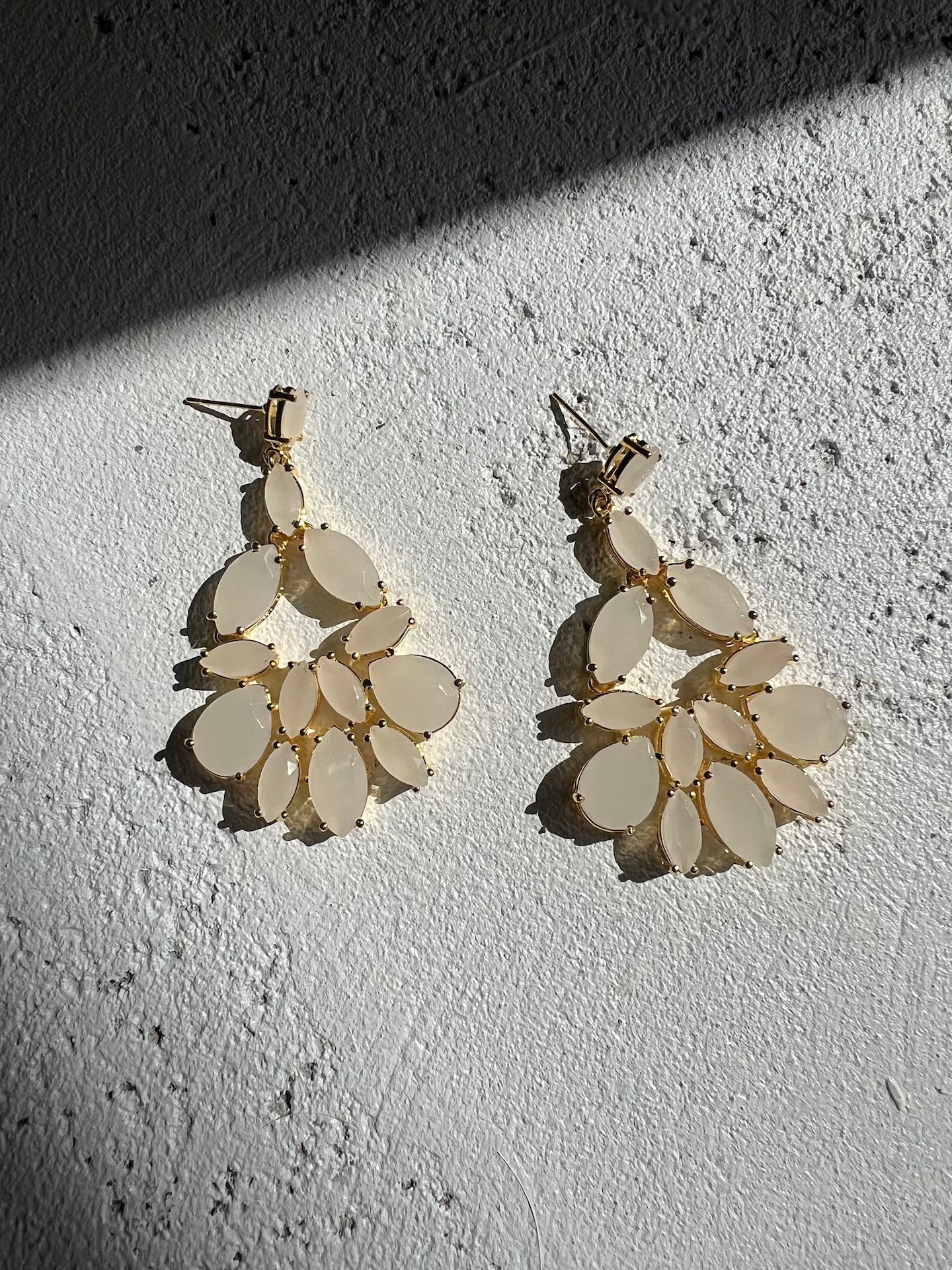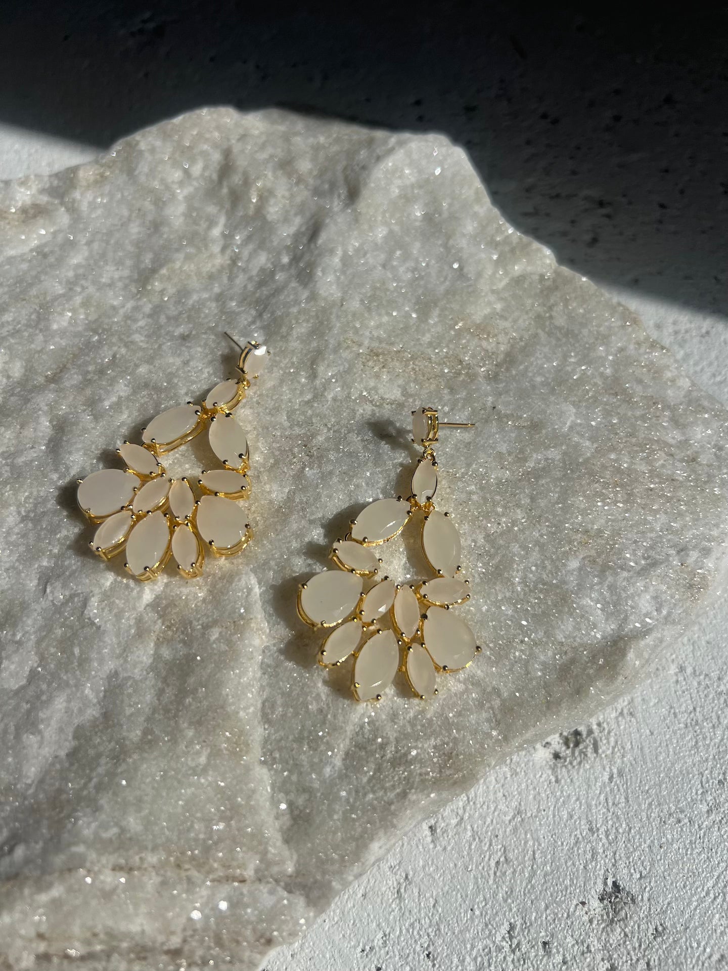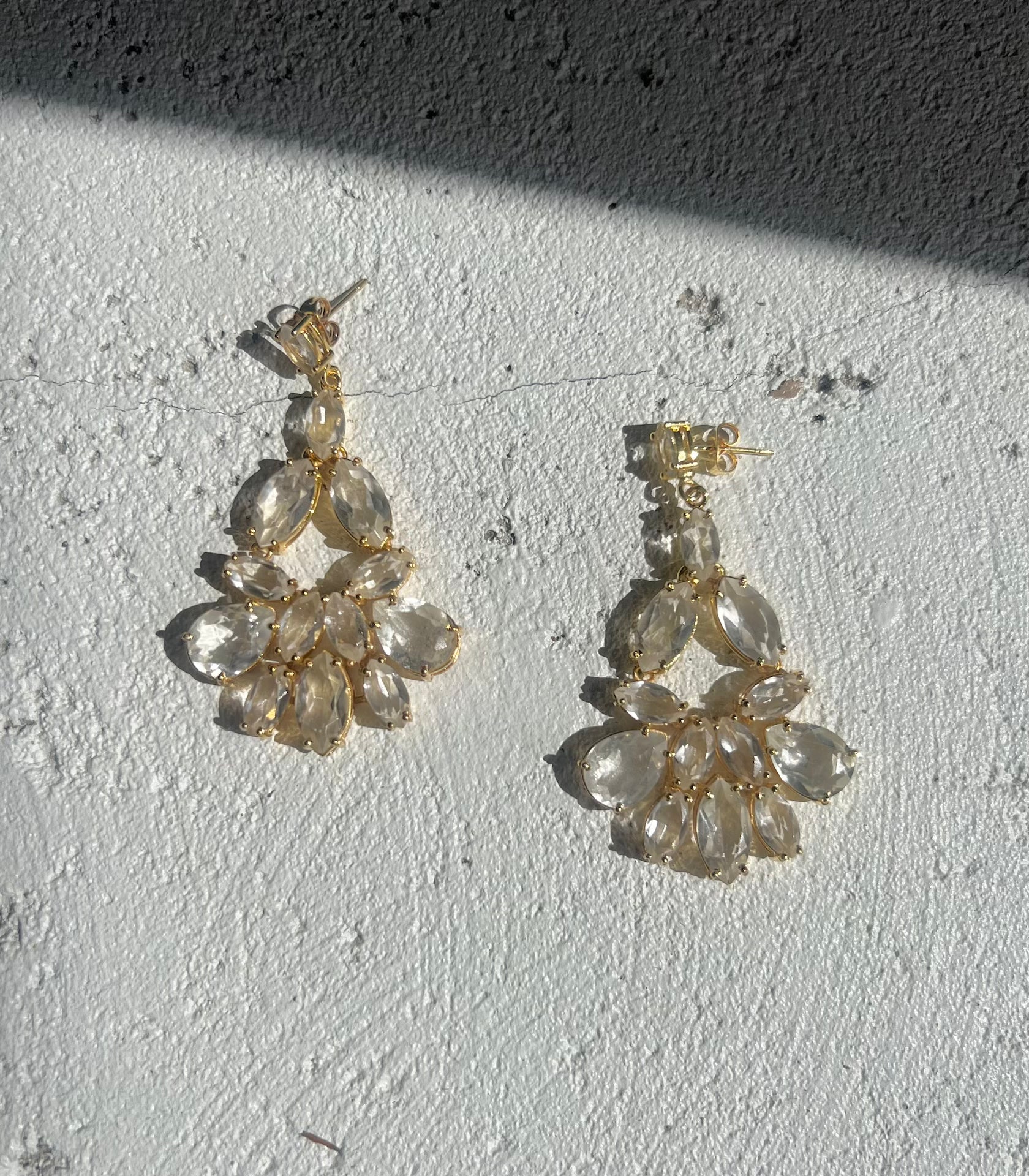 These earrings are made from crystal quartz. They are set in 18k gold-plated brass. 100% Nickel, lead and cadmium free.