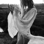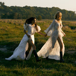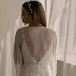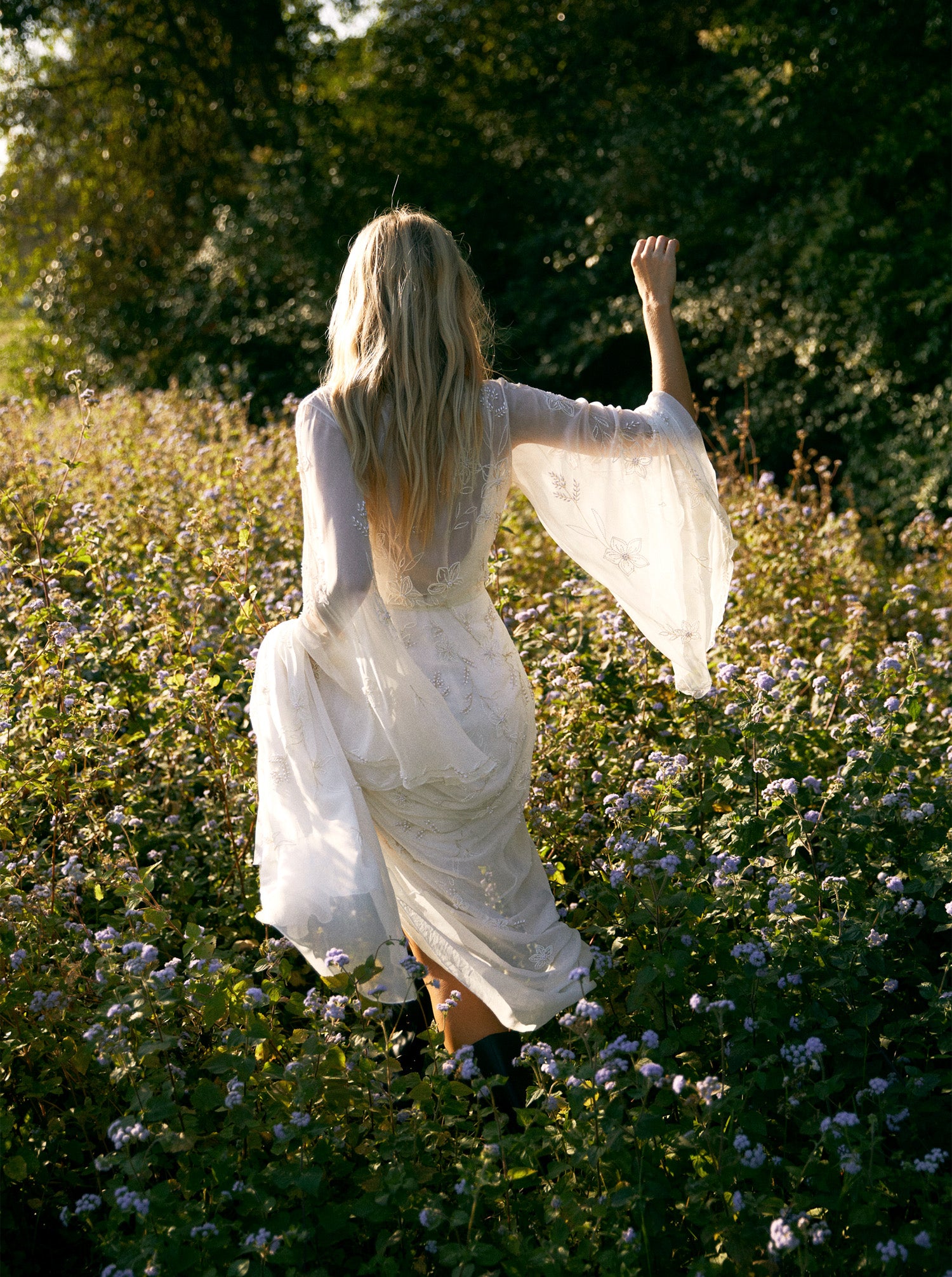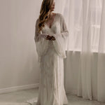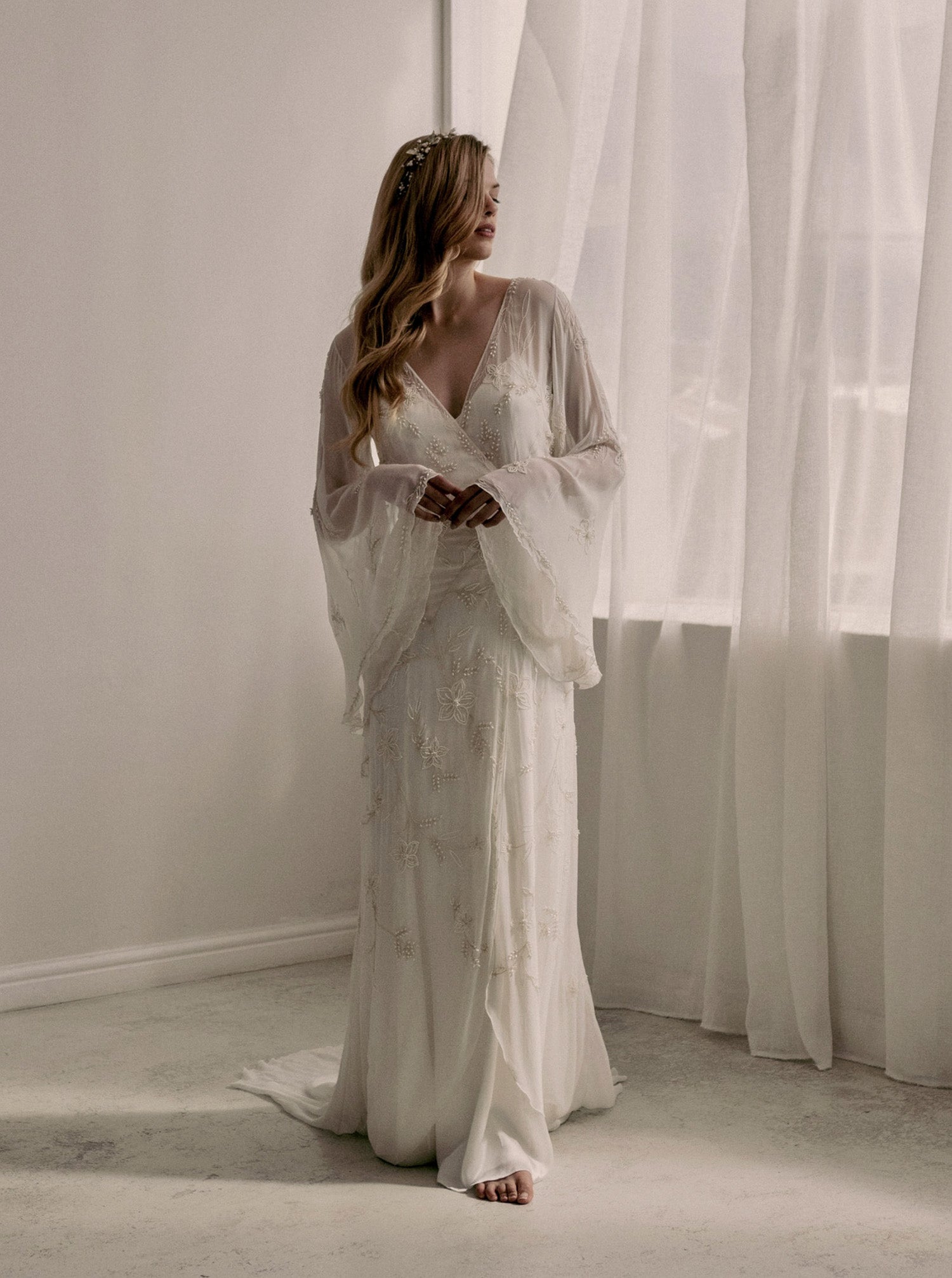 The Dahlia Gown is divinely bohemian. Diaphanous georgette is fully hand-beaded with a delicate floral motif, rendered in glass beads and faux pearls. The dramatic bell sleeves are edged with a border of leaves in shades of pale gold and ivory. Two fine rouleau ties secure the wrap closure, and the A-line skirt fans out in a sweeping train.