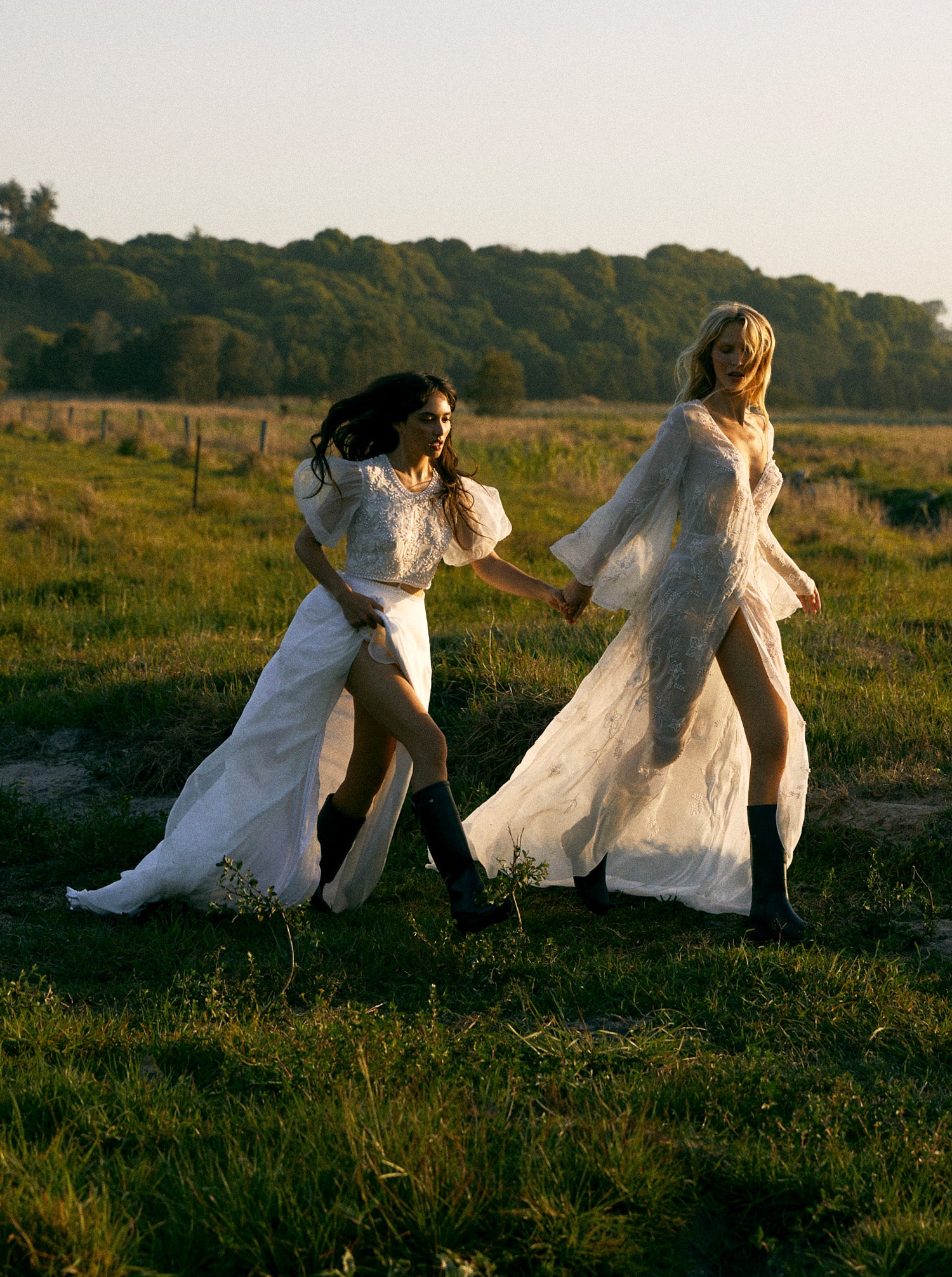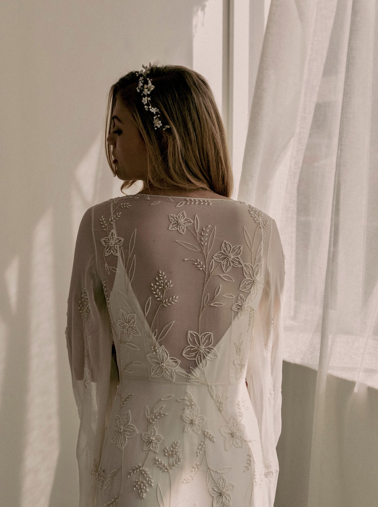 Each Bo & Luca piece is carefully hand-beaded in India by artisans who are trained in the traditional art of tambour embroidery. Our silk is hand-dyed in loose-leaf white tea, which creates a characteristic soft ivory hue. All Bo & Luca gowns are made-to-order and take 6-12 months to create.