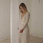 Each Bo & Luca piece is carefully hand-beaded in India by artisans who are trained in the traditional art of tambour embroidery. Our silk is hand-dyed in loose-leaf white tea, which creates a characteristic soft ivory hue. All Bo & Luca gowns are made-to-order and take 6-12 months to create.