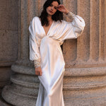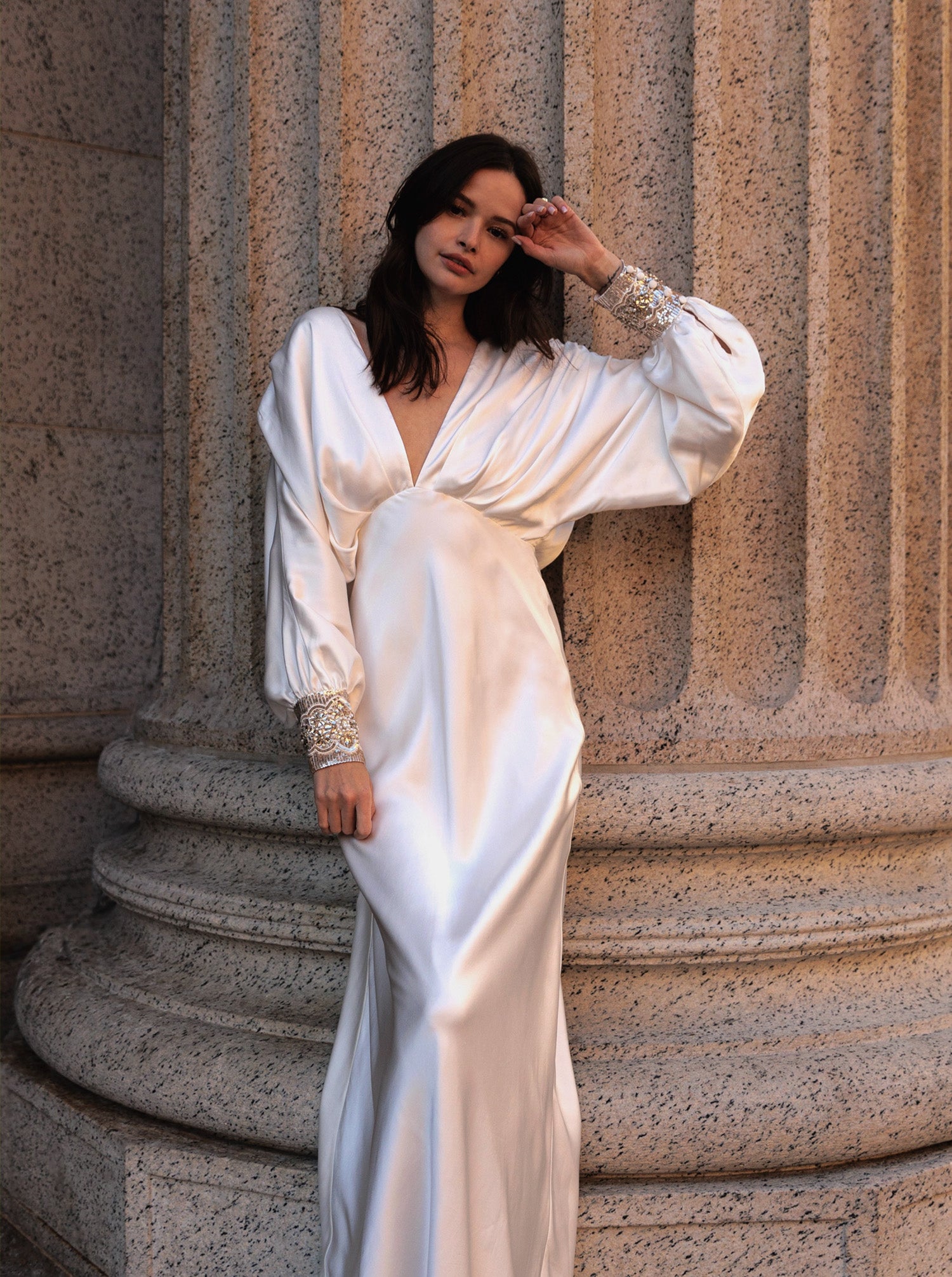 The Gardner Gown exudes effortless glamour. The deeply romantic draped bodice features a blouson waist, plunging V-neck, and voluminous Dolman sleeves. Bold Art Deco inspired hand-beaded cuffs are worked in shades of vintage gold and cognac sequins, bugle beads and faceted crystals, and are fastened with delicate covered buttons. The bias-cut skirt is fitted at the hip and spreads out in a graceful train. Fine bias ties adorned with silk petals secure the open back, and the gown closure is an invisible zip at the centre back. Off-white beaded cuffs are available on request.
