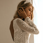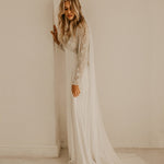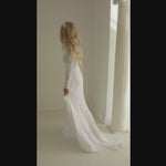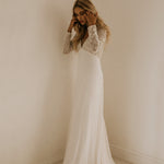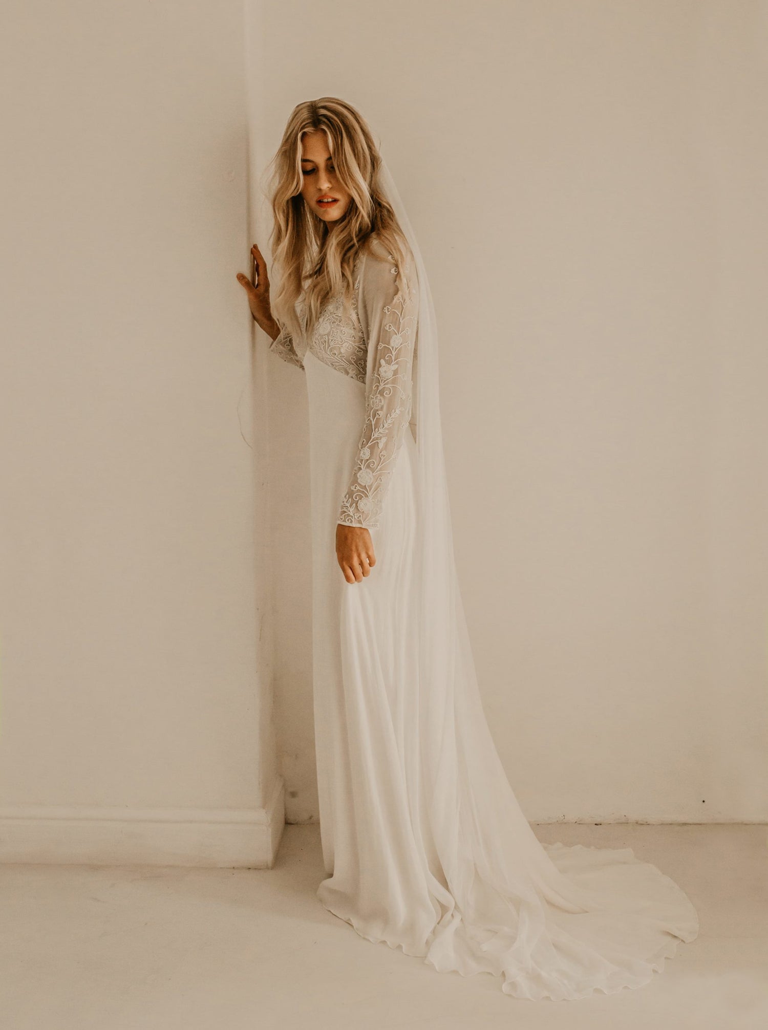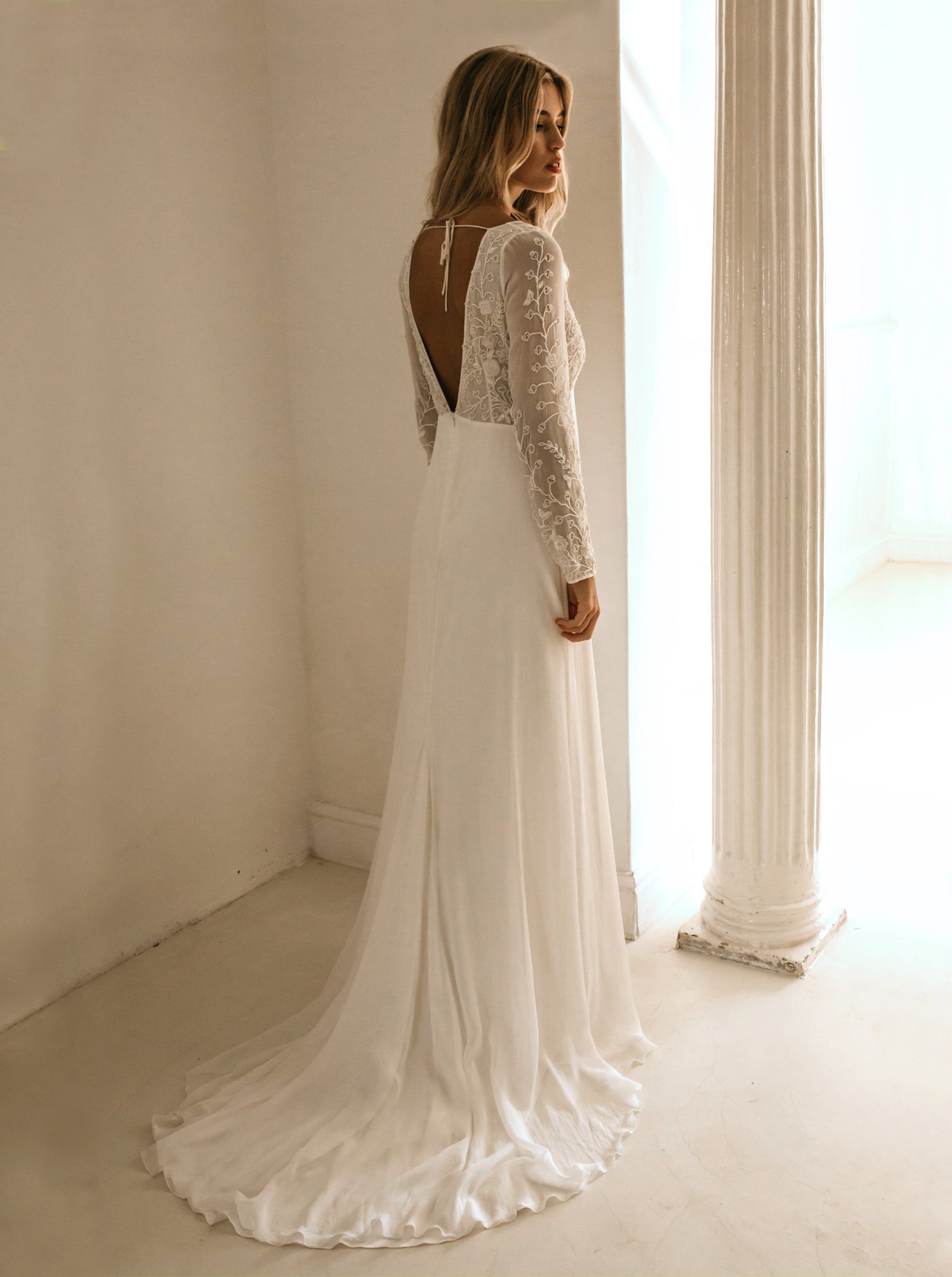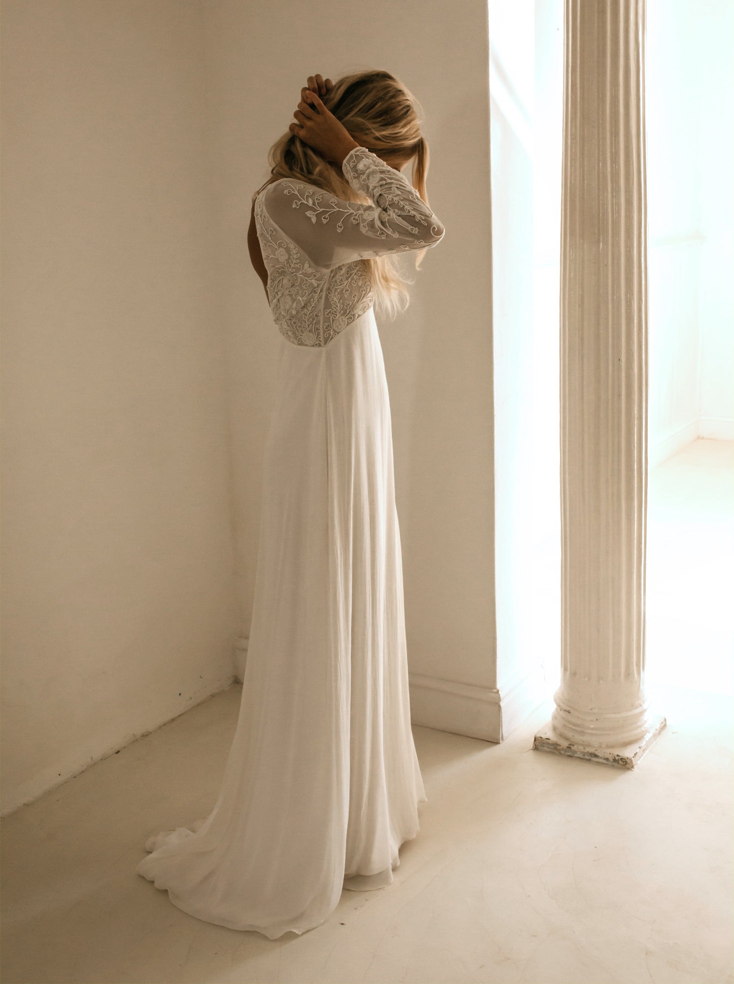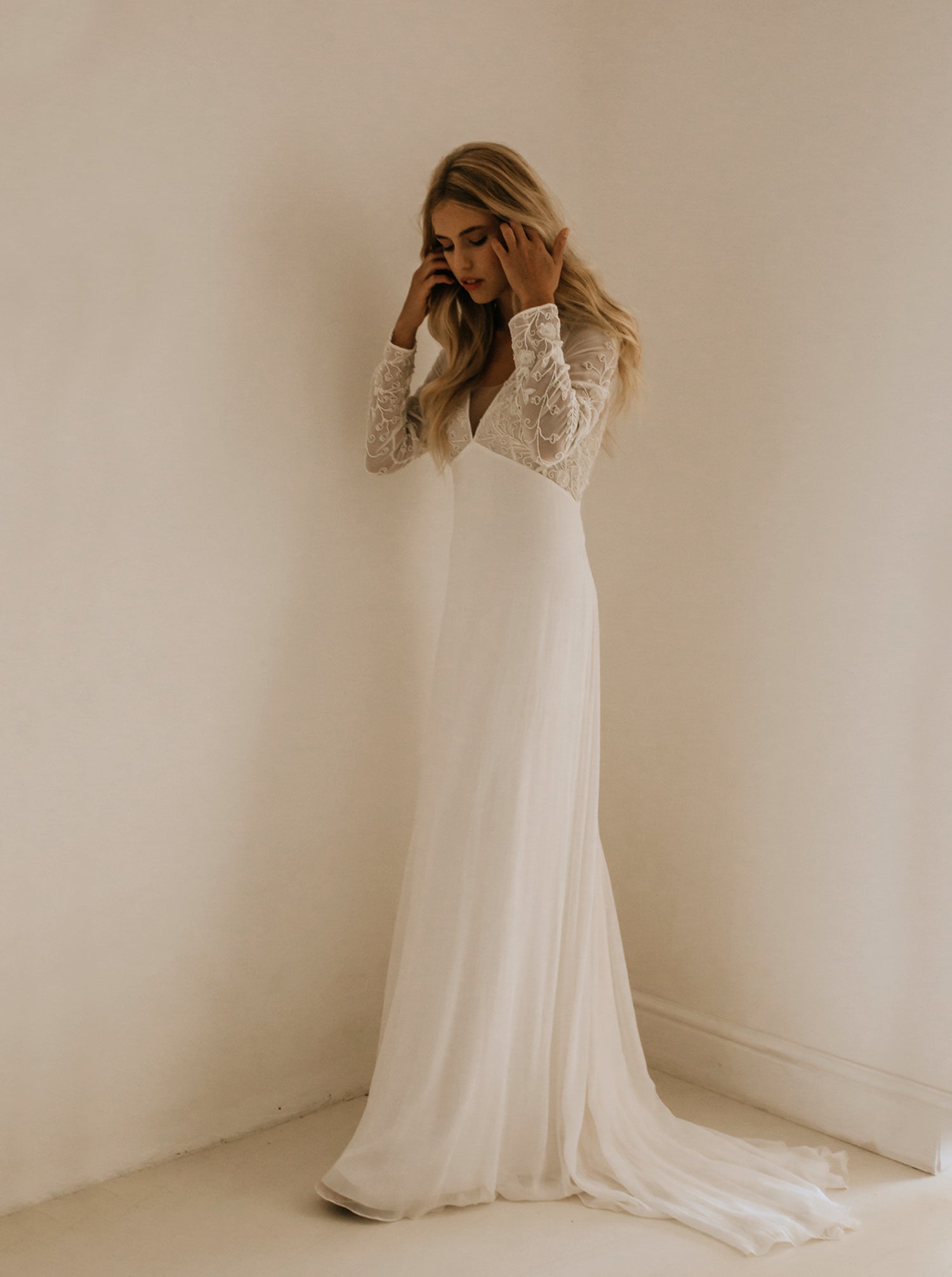 The Lennox Gown has a semi-fitted bodice and sleeve. The empire skirt is fitted below the bust and is true to size. The train is 35cm long.