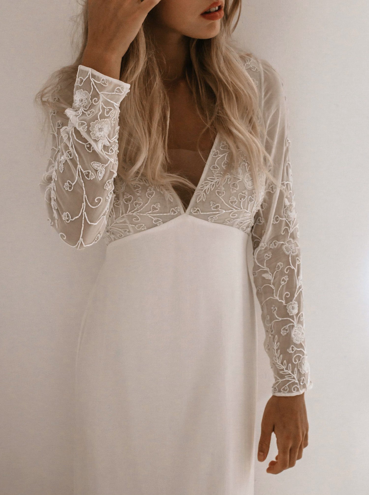 Each Bo & Luca piece is carefully hand-beaded in India by artisans who are trained in the traditional art of tambour embroidery. Our silk is hand-dyed in loose-leaf white tea, which creates a characteristic soft ivory hue. All Bo & Luca gowns are made-to-order and take 6-12 months to create.