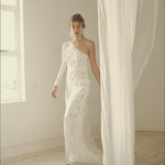 The Gabrielle Gown is an inimitable couture piece. The entire gown is hand-beaded with unfurling flowers rendered in sequins, glass beads and satin thread, in hues of ivory and pale silver. The striking asymmetrical cut exposes one shoulder and features a single sleeve - lightly gathered at the shoulder adding subtle volume, and fastened at the wrist with silk-covered buttons. Fitted to the hip, a narrow silk band encircles the waist. The elegant column skirt fans out to form a regal train. The gown closure is an invisible zip on the left side.