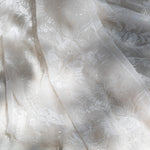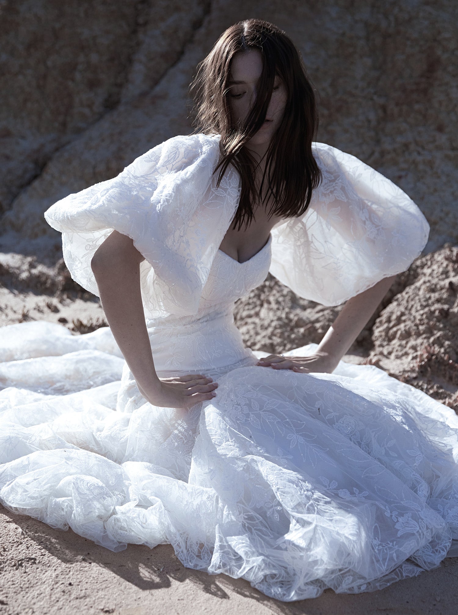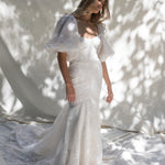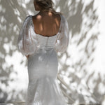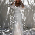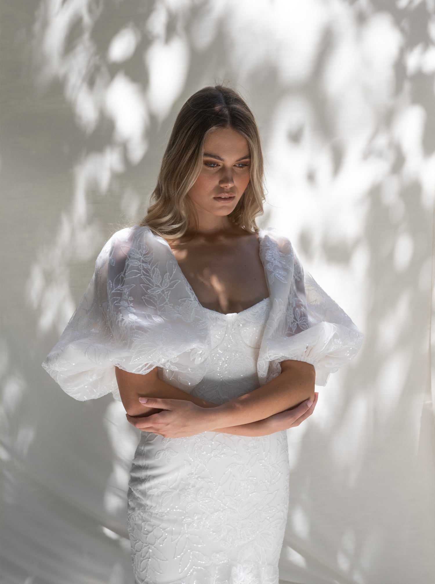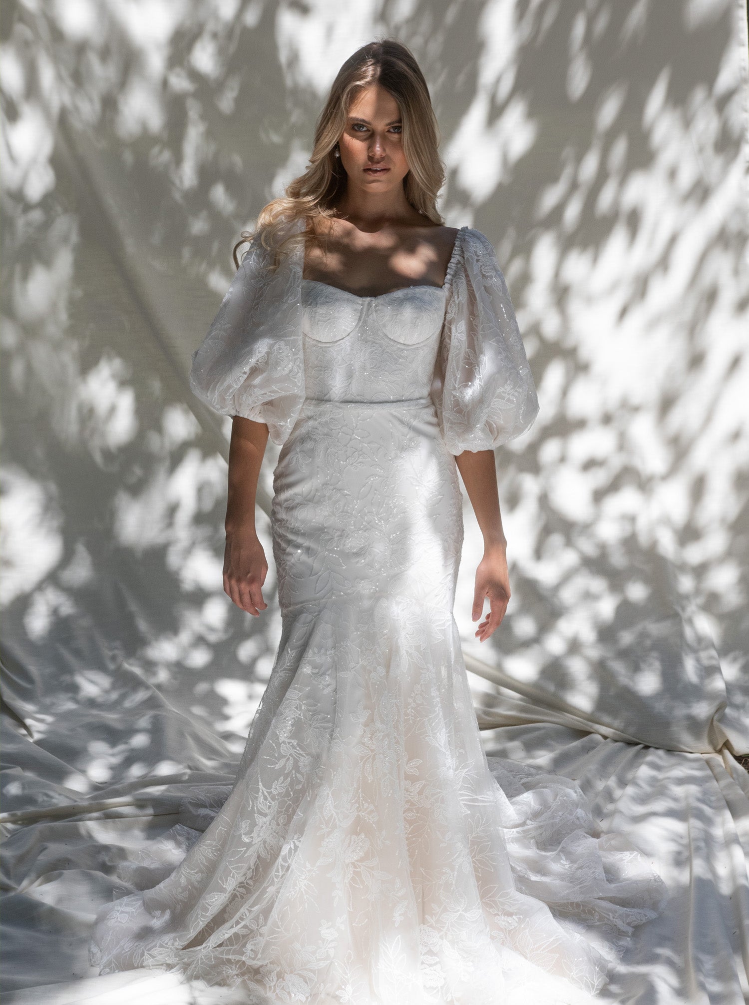 The Ellery Gown is deeply romantic. This figure-hugging piece is crafted from subtly sequined lace lined with a soft blush tulle. The corseted bodice is fully boned with padded cups, and the back is decorated with a row of small covered buttons. The joyfully voluminous sleeves are elasticated at the shoulder and cuff so you can choose to wear them off-the-shoulder. The waist is encircled with a narrow inset band that closes at the back with a single covered button. The fit and flare skirt has a gentle sloping horizontal seam that cascades outward below the hip, ending in a regal train. The gown closure is an invisible zip at the centre back.