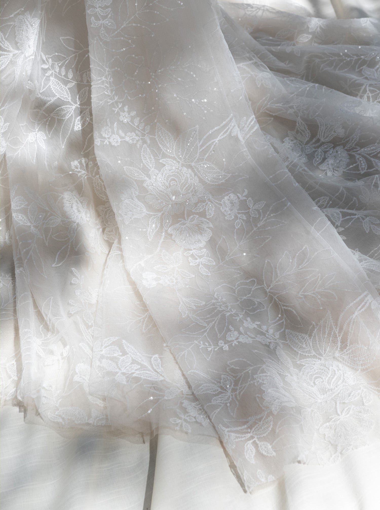This gown is made from sequinned lace. It is lined with Italian tulle and crêpe.