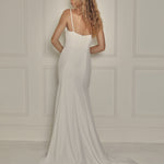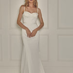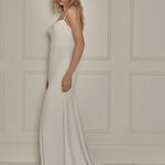 This gown is available in soft crêpe or satin. Both options are self-lined.