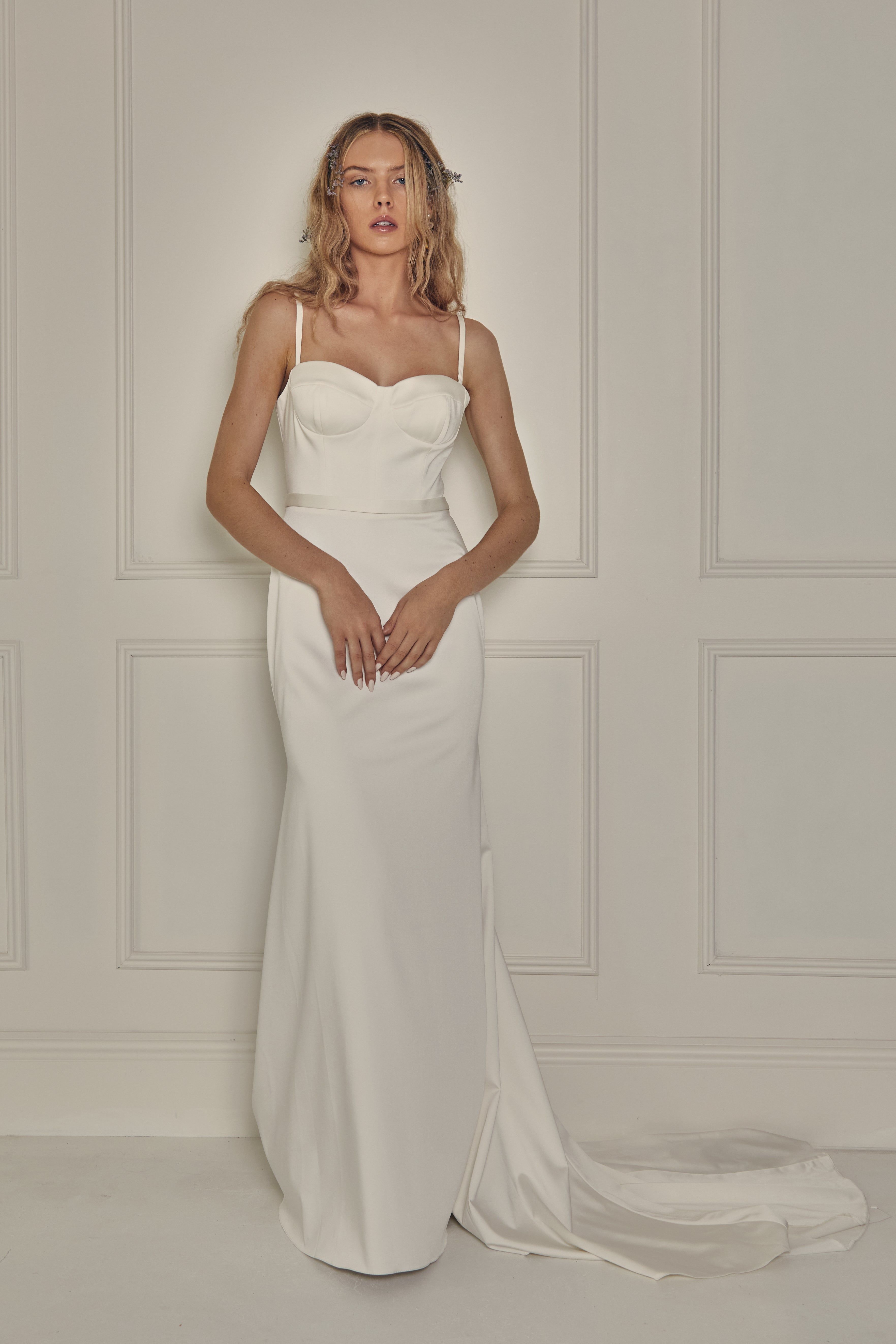 The Skylar Gown is minimalist perfection. This impeccably tailored fit-and-flare gown features a corseted bodice with padded cups and delicate straps. A narrow band encircles the waist fastened with a single covered button at the back. The full train adds a sense of drama to this understated piece. Style it with the Rosalie Draped Tulle Sleeves or Rosalie Gathered Organza Sleeves to add a touch of romance to this look.