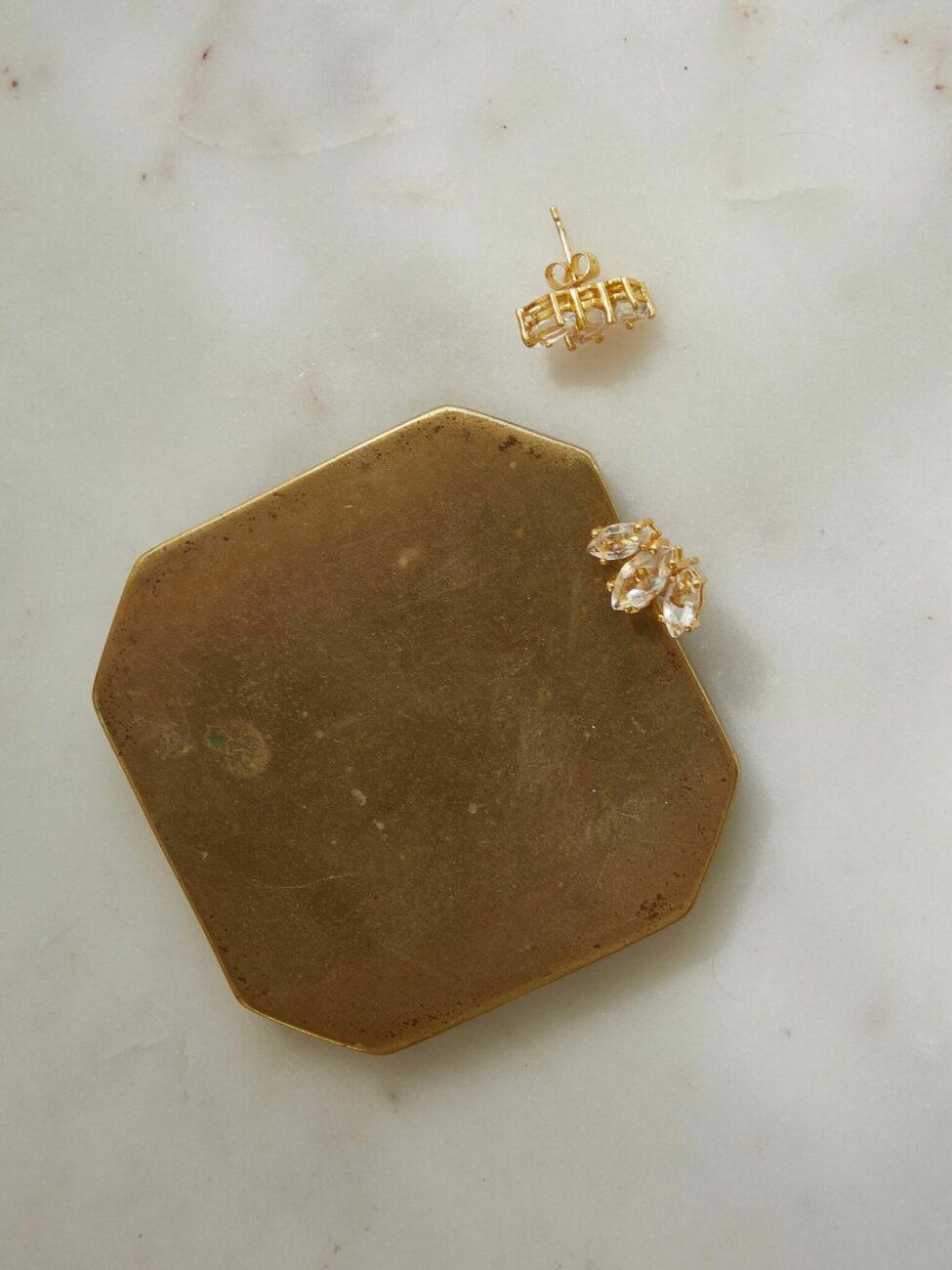 These earrings are made from clear crystal quartz. They are set in 24k gold-plated brass. 100% Nickel, lead and cadmium free.